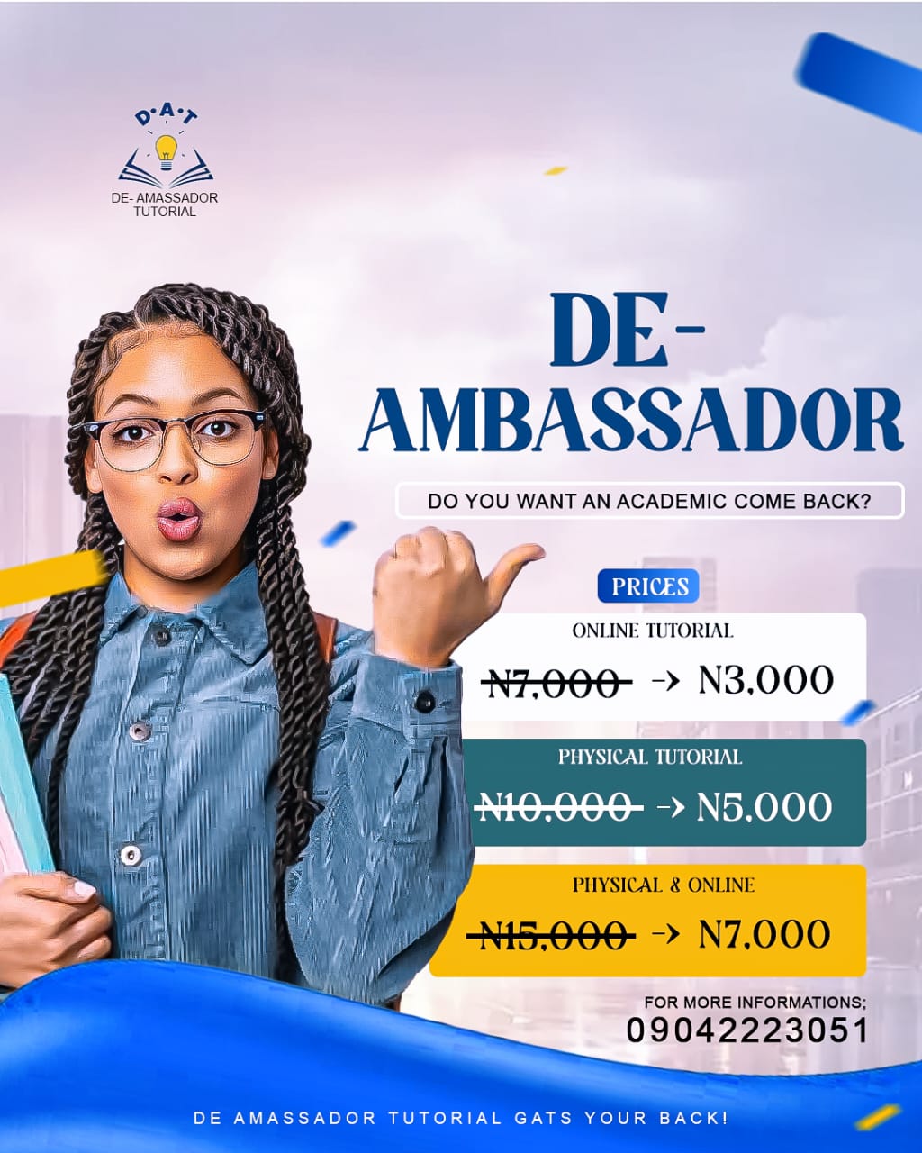 DE-AMBASSADOR TUTORIAL hosts two form of learning sessions Which is Physical and Online classes to further ensure that students achieve success in education and learning